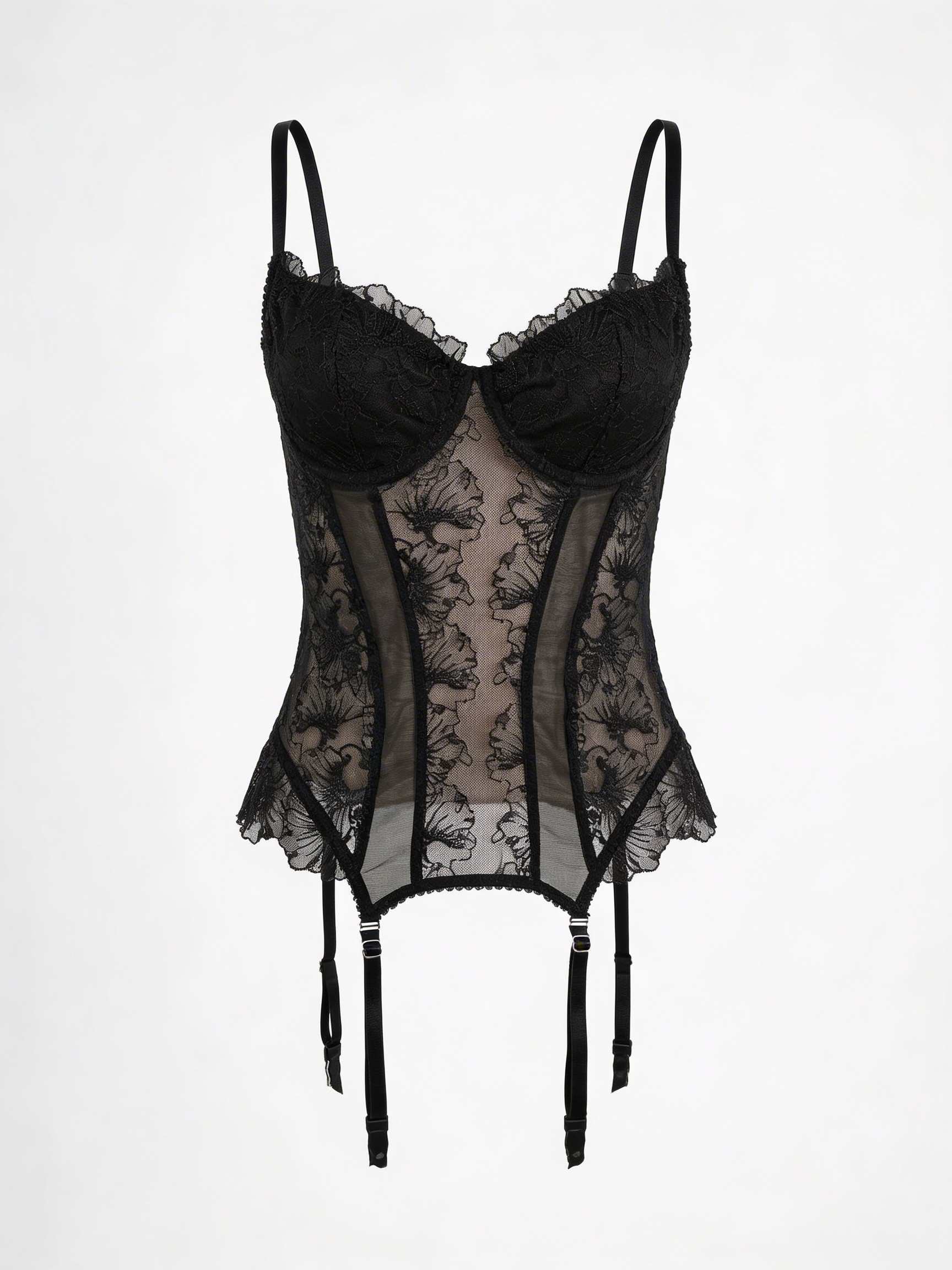 Съёмные держатели для чулок добавляют вариативности: их можно снять или оставить как изящный декоративный акцент. Регулируемые бретели позволяют точно настроить посадку, а металлическая фурнитура подчёркивает премиальность изделия и завершает образ.