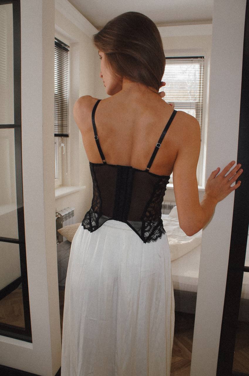 При этом, в отличие от классического корсета, в модели отсутствуют вертикальные косточки в стане изделия, что делает топ значительно более комфортным для повседневной носки. Он не сковывает движения и остаётся удобным в течение всего дня.