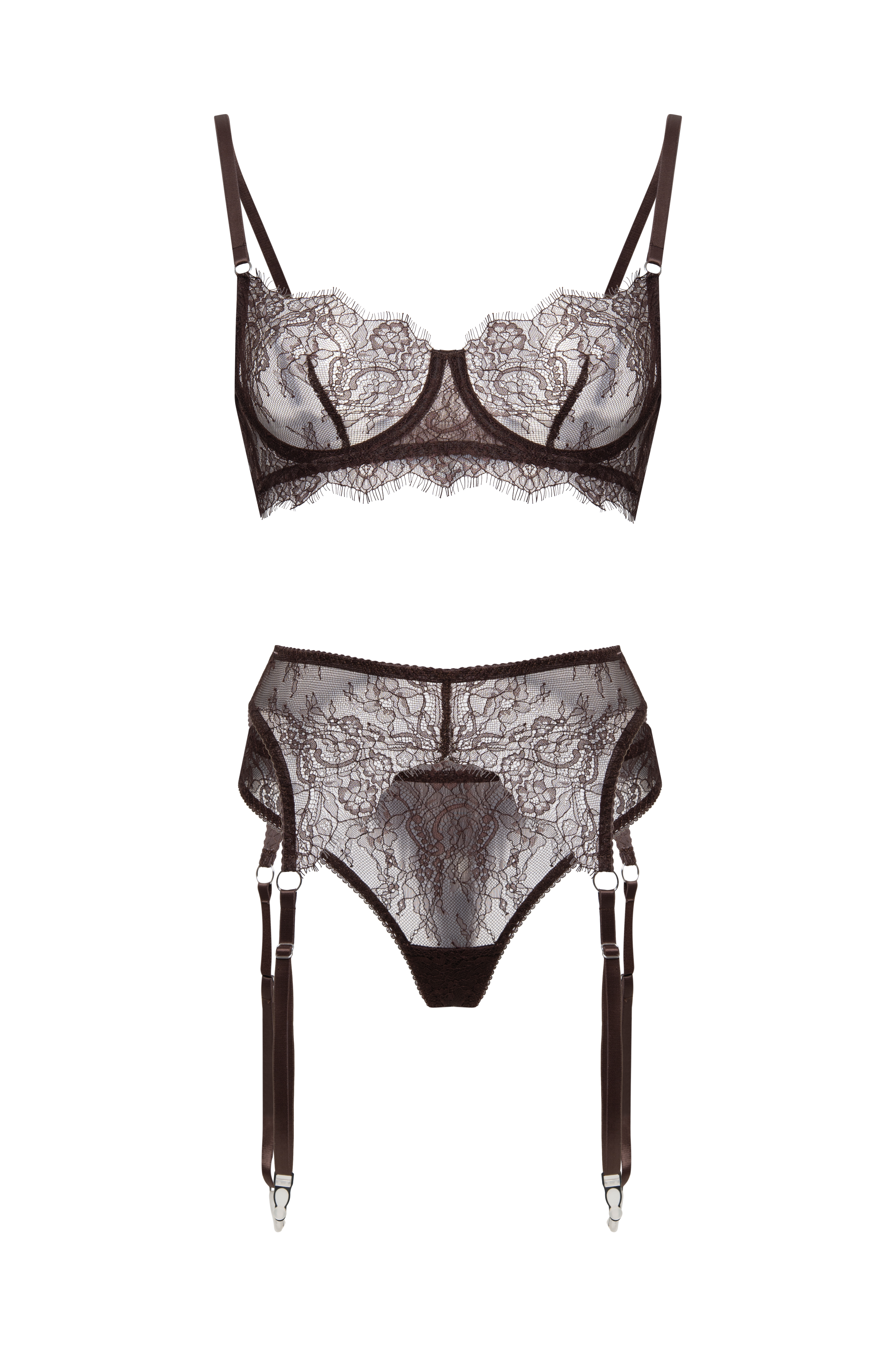 Он выполнен из невесомого кружева шантильи — благородного, деликатного, почти воздушного. Мягко подчёркивает линию талии, добавляя образу утончённой чувственности, оставаясь при этом комфортным и продуманным до мелочей.