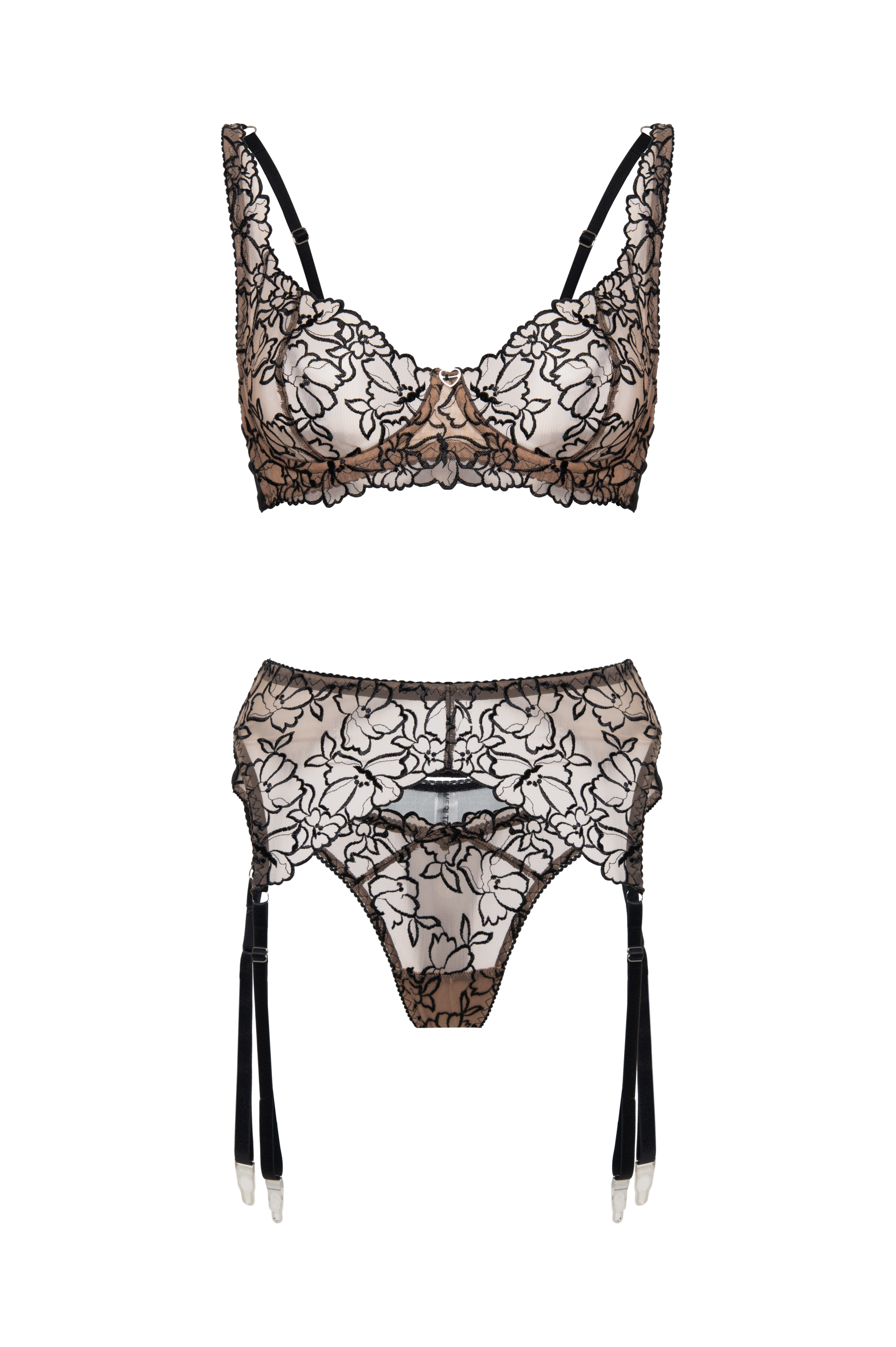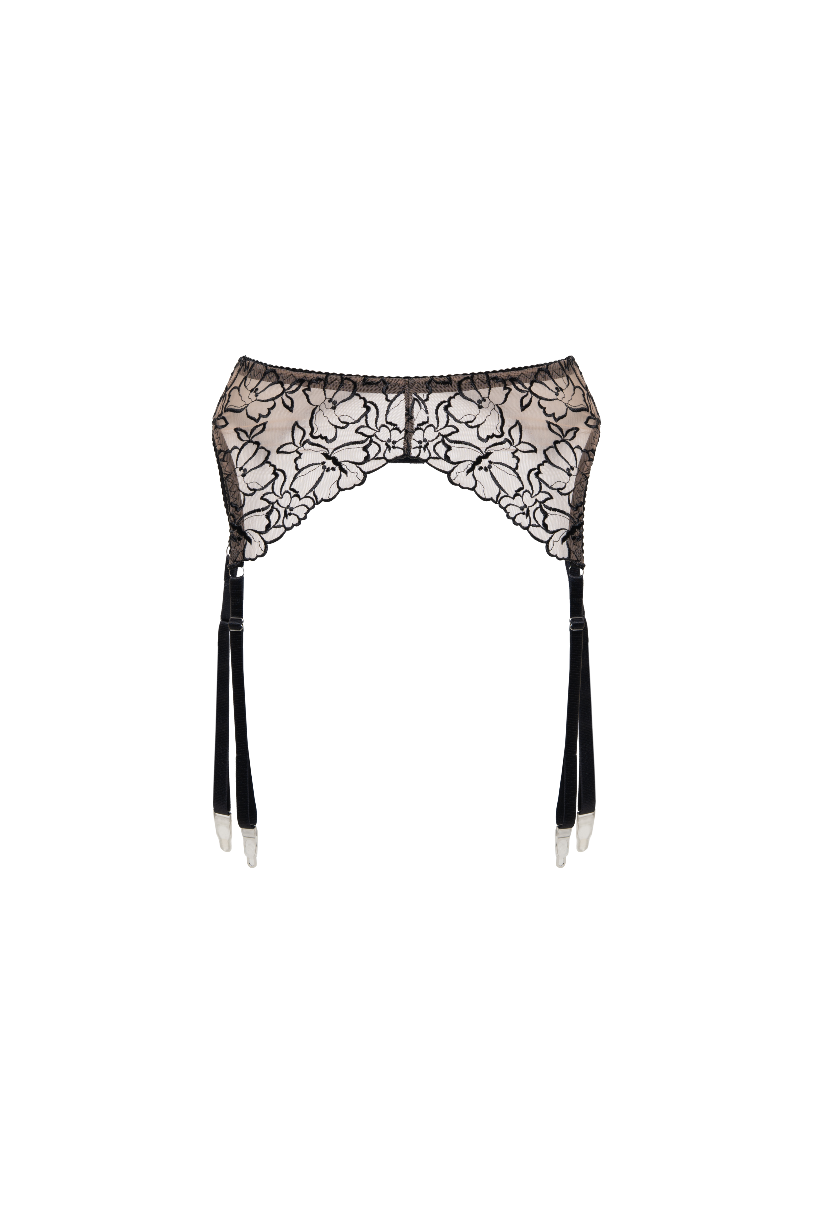 На фото пояс из цветочной вышивки на сетке с застежками для чулок, но если нужен вариант с гартерами вокруг ног, воспользуйтесь выбором в выпадающем меню.
